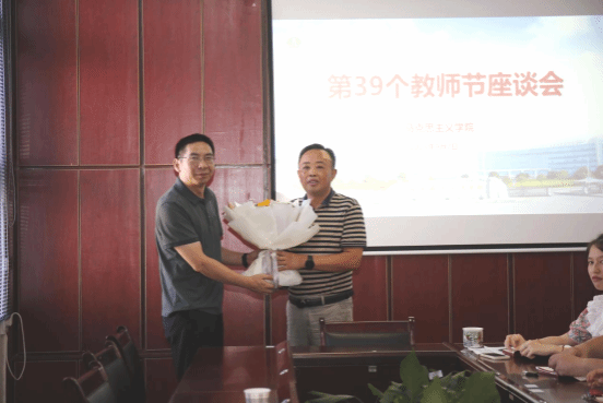 9月7日,桂花香飘校园,在第39个教师节来临之际,校党委书记高焕清专程来到beat365中文官方网站,慰问思政课教师,为马院教师代表常卫峰献花及合影,参加beat365中文官方网站教师节座谈会,对beat365中文官方网站全体教师送上了诚挚的节日祝福。