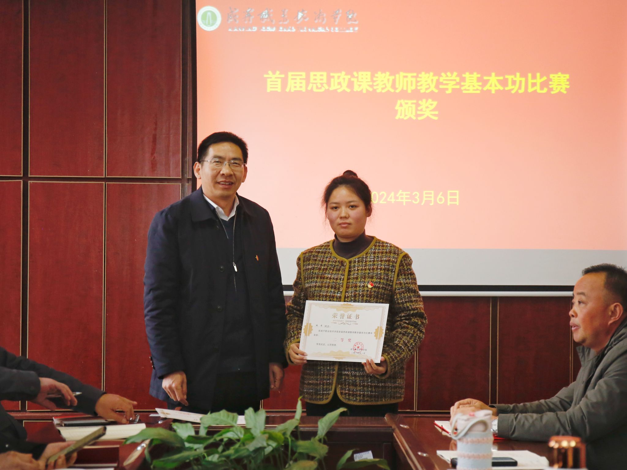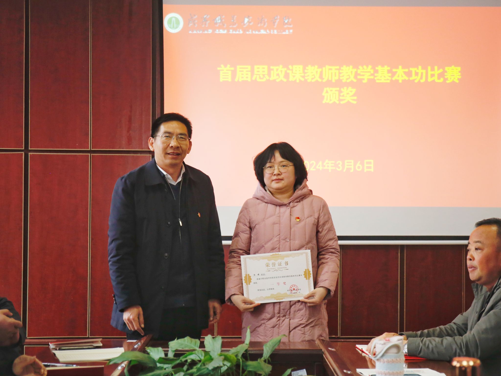 校党委书记高焕清给一等奖获得者陈娟老师颁发证书