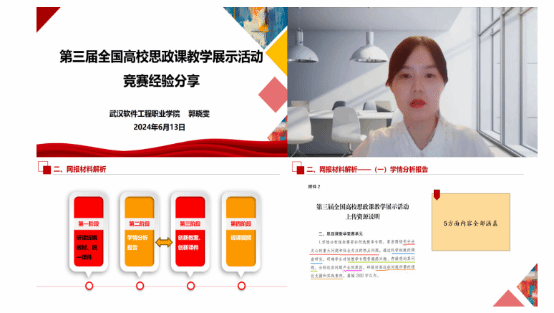 在培训中,郭晓雯老师从赛事流程分析、网报材料解析、现场展示解析、教师备赛建议、教师疑问解答等六个方面,结合自己参加第三届全国高校思政课教学展示活动荣获“教学竞赛单元”一等奖的参赛经历,针对活动前搜集的教师问题进行竞赛培训指导。beat365中文官方网站思政课教师针对目前备赛中存在的其他问题进行现场提问并进行自由交流。
