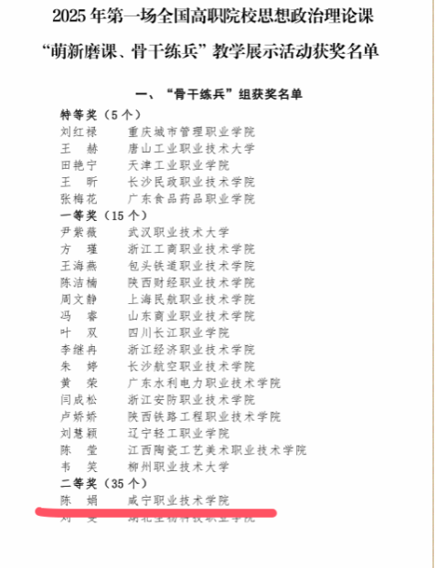 2025年3月28日-30日,由全国高职高专院校思想政治理论课建设联盟主办的2025年第一场全国高职院校思想政治理论课“萌新磨课·骨干练兵”教学展示活动在南宁市隆重举行。beat365beat365中文官方网站教师陈娟荣获“骨干练兵”组二等奖,这是beat365在该项赛事中再度取得的佳绩!
