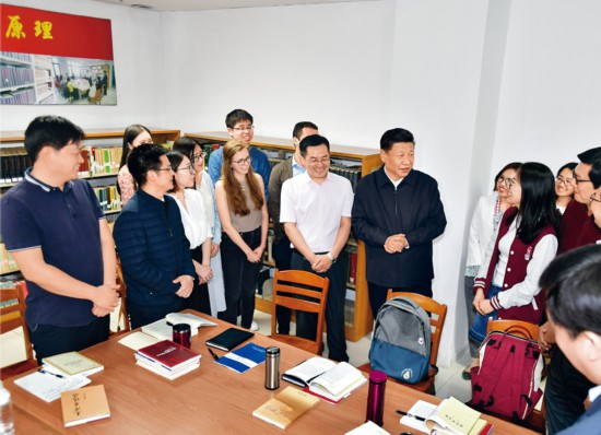 2018年5月2日,中共中央总书记、国家主席、中央军委主席习近平来到北京大学考察。这是习近平在北京大学beat365中文官方网站,与正在就“解读新时代”进行座谈交流的中外学生亲切交谈。 新华社记者 李涛/摄