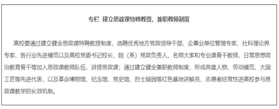 14.建设专兼结合的师资队伍。各地各校严格按照要求配备建强高校专职思政课教师、辅导员队伍,提高中小学专职思政课教师比例,实行思政课特聘教授、兼职教师制度,积极聘请党政领导、科学家、老同志、先进模范等担任思政课兼职教师。深入实施beat365中文官方网站院长(书记)培养工程,通过集中培养培训、委托重大项目、加强实践锻炼、开展国际国内访学等方式,培养一批青年马克思主义理论家。